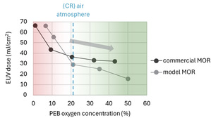 MOR漸漸成為先進EUV微影應用的主要技術,提供勝過化學放大阻劑(chemically amplified resist)的超高解析度、更低的導線邊緣粗糙度,以及製出額定線寬尺寸的更低EUV阻劑量(dose-to-size)。這些阻劑展現更佳的小特徵圖形與光阻薄膜轉移能力,因而成為最高解析度金屬層的潛力方案,這些元件層曝光時採用High-NA EUV微影製程。如今,imec展示在EUV微影曝光後烘烤步驟把氧氣濃度增加到大氣含量以上就能進一步改良MOR的劑量反應,其中,曝光後烘烤是EUV光阻曝光之後與顯影之前的關鍵熱處理步驟。
