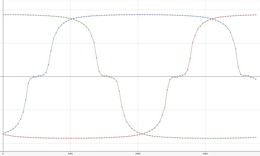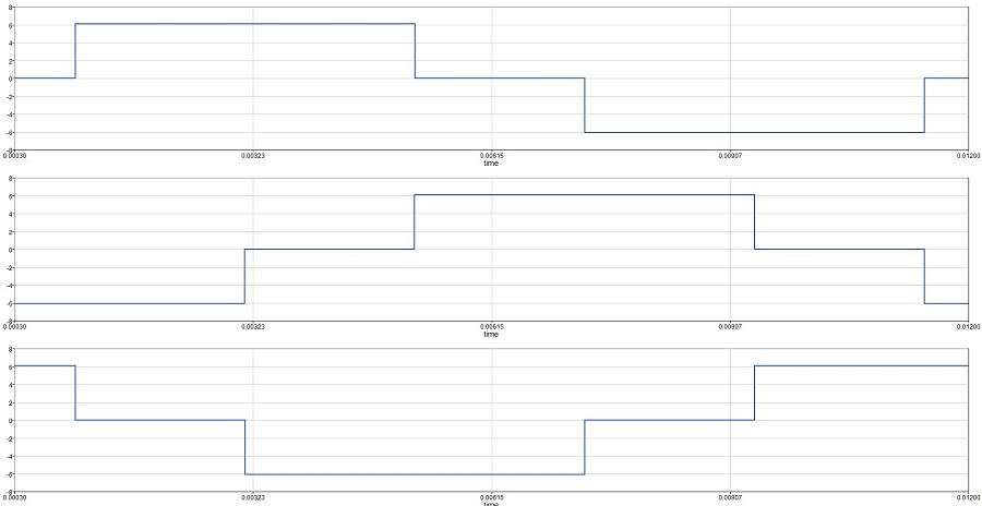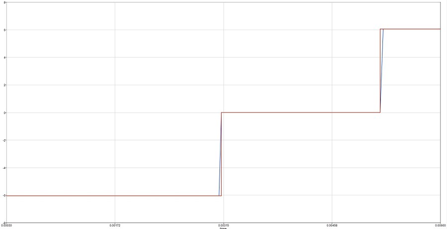 此模型的六步方波是由角度計算時間建立而成,並非實際的由霍爾元件切換狀況形成,與實際狀況仍有一段差距。因此接續將先採用理論計算UVW三相的霍爾元件位置,再於Flux內匯出這三個霍爾元件的磁通密度數值。將磁通密度數值匯入Activate軟體,設定切換開關狀態的數值後, 建立霍爾元件基準的六步方波並與時間基準的六步方波波形比較。