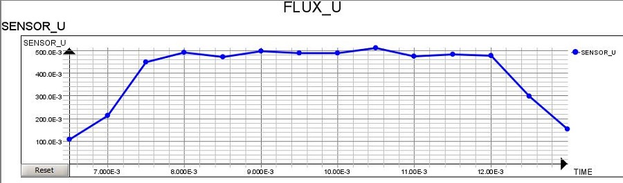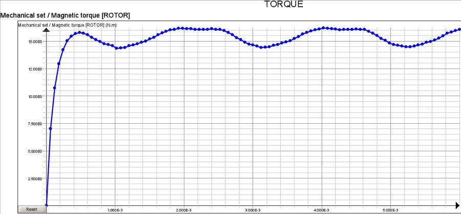 在Altair的電磁模擬軟體Flux內建立 8極 9槽馬達模型(圖3),觀察U相磁通量波形如圖4所示的梯形波。輸入馬達的六步方波電流由Altair發行之系統開發平台軟體Activate建立,由轉子角度與轉速計算得知六步方波的切換時序,確保電流與磁通量的夾角為90度,建立時間基準的六步方波電源,輸入Flux的馬達模組,扭力曲線如圖5所示。