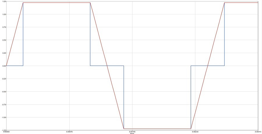 接下來,比較時間基準的方波與霍爾元件基準的方波波形(圖9),可見兩種方式建立的六步方波非常相似,霍爾元件基準建立的六步方波與實際狀況相似,同時也吻合物理理論計算的結果。