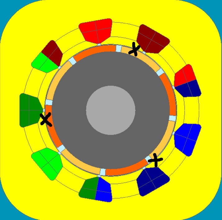 如圖3所示,可知 U相中央定子齒部的機械角為80度,正對深橘色的S磁石,此時的轉子角度為U相的d軸狀況。右 側NS的磁中性點機械角為57.5度。磁中性點到中央定子齒部角度為80-57.5=22.5度,電氣角度為22.5*4=90度。