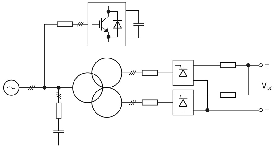 基於閘流管的多脈衝轉換器是一項成熟且眾所周知的技術。圖四所示為12脈衝閘流管整流器,由具有兩個低壓二次側繞組的星形-三角形-星形電力頻率變壓器組成。二次側繞組驅動兩個六脈衝閘流管整流器,輸出以並聯連接。如果此整流器直接驅動電解槽,則閘流管觸發角會控制輸出電壓以及流入的電流。觸發角還可在面臨電解槽電池老化以及電池堆所需的電壓增加下,用於維持系統中的電流。變壓器也可能包含有載分接頭切換器 (OLTC)。OLTC在多個接入點之間切換或在其中一個繞組上進行分接,升高或降低供應至整流器的電壓,藉此改變變壓器匝數比。