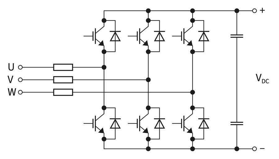 傳統整流器會產生非正弦線路電流,主動整流器與之不同,其具有與IGBT串聯的電感,可保持線路電流為正弦波並減少諧波。IGBT導通時的阻抗非常低,相較於標準整流器,可減少導通損耗並提高效率。主動整流器控制器可維持一致的PF,因此無需外部功率因數校正(PFC)元件。此外,還可在更高的切換頻率下運作,因此可採用更小尺寸的被動元件和濾波器。