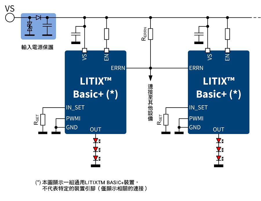 LITIX Basic+系列隸屬於LITIX LED 驅動器系列產品,適用於汽車LED應用。除了適用於中低功率車外燈的 LITIX Basic+,也可使用LITIX Basic和LITIX Linear 因應後車燈的各種高低功率應用。LITIX Basic 也用於車內 LED 應用(例如 LED 閱讀燈),或是日間行車燈 (DRL)等注重成本的車前燈應用。LITIX Power 系列由適合 LED 的 DC/DC 轉換器組成,可用於 DRL、近光燈及遠光燈照明等應用。LITIX Power Flex系列DC/DC轉換器自2016 年起支援高功率及節能型車前燈應用。