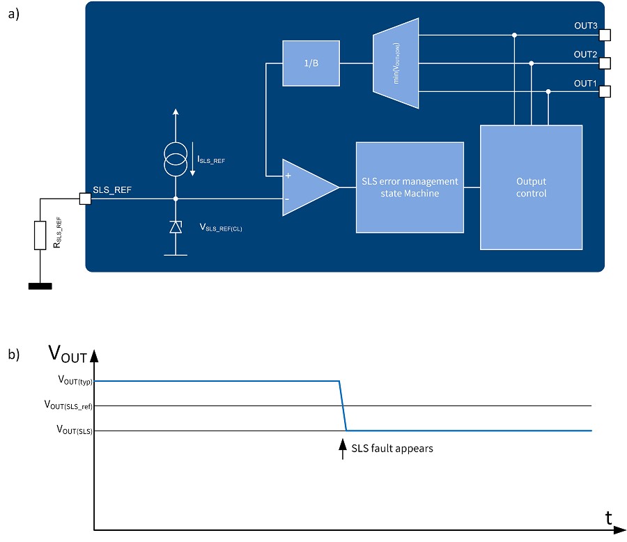 參考電壓會依據使用中的LED及其操作點(LED 電流、溫度),由 SLS-REF 針腳的電阻進行調整(圖 4b)。根據系統需求,故障時產生的行為可透過兩個針腳(D及DS)設定為下列方式:由 LED 驅動器在 ERRN 針腳回報故障,或是回報故障並關閉;關閉時可能會出現 10 nF 的少量延遲。