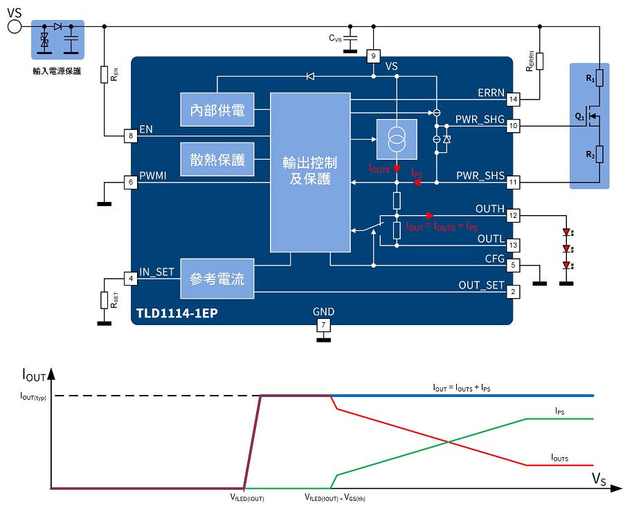 圖中顯示LED電流分為內部電流IOUTS