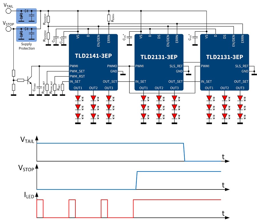 許多車款都是以相同的 LED 實作各種尾燈功能,例如整合式尾燈煞車燈。只要調整 LED 電流,就可產生所需的不同燈光功能,通常是利用脈寬調變(PWM)加以實作。LITIX Basic+系列提供三項元件搭載整合式PWM計時器模組,分別是TLD2141-3EP (1in/3out)、TLD2252-2EP(2in/2out)及TLD2142-1EP(1in/1out)。整合式尾燈功能可透過變更脈寬提供,符合成本效益:例如 100% 用於煞車燈,20%則用於尾燈。