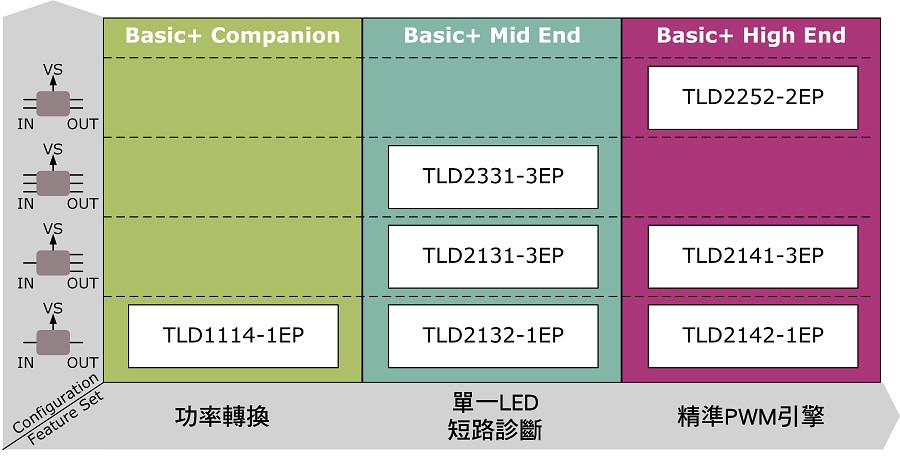 英飛凌全新的 LED 驅動器系列 LITIX Basic+(圖一),可因應持續增加的設計需求。其中包含七項全新裝置,讓 2013 年上市的既有 LITIX Basic 系列產品更加完備。這兩款驅動器系列產品都使用高壓側線性電流來源,用於低功率及中功率的外部燈光,此外,也適合車內及工業 LED 照明等各種應用。