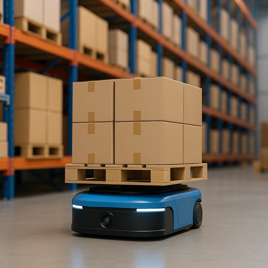 | 圖一 : 自動搬運車(AMR)在倉庫內搬運貨物,展現自動化降低人力依賴。 |