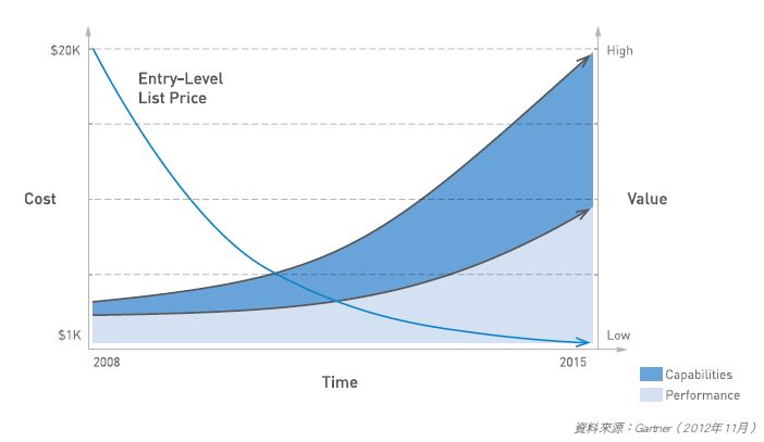 | 圖二 : 2008-2015年3D印表機價格的成本與價值曲線 資料來源:Gartner(2012年11月) |