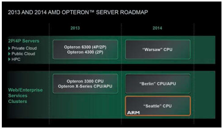| 圖一 : AMD於2013年揭露2014年的伺服器平台藍圖,其中ARM在Web與企業端扮演了一定程度的角色(Source:AMD) |