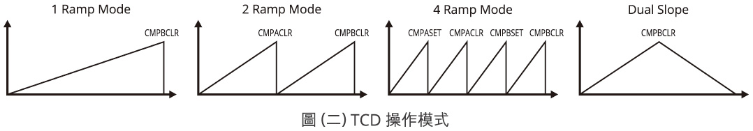 TCD 支援四種操作模式:一斜坡、二斜坡、四斜坡和雙斜坡。這些名稱代表計數器經歷的週期數。四斜坡模式經歷四個週期,依序重置 CMPASET、CMPACLR、CMPBSET 和 CMPBCLR。兩個斜坡模式經歷兩個週期,依序在 CMPACLR 和 CMPBCLR 上重置。一斜坡模式僅在 CMPBCLR 上重置。最後,雙斜率模式向上計數到 CMPBCLR,然後向下計數到零。為了便於觀察目的,下圖的每個斜坡末端都位於相同的位置;但是,當值不相等時,它們會有所不同。此外,未顯示的值(例如:單一斜坡模式下的 CMPASET)仍然有效,但在此期間不發揮作用。