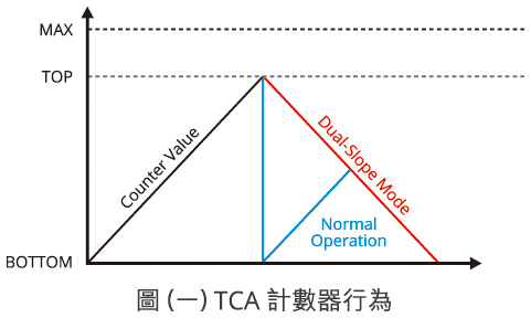 TCA 是一款針對產生脈寬調變 (PWM) 最佳化的計時器。它可以在 16 位元模式下運行,以獲得高解析度輸出,也可以在 2x 8 位元模式下運行,其中計時器的任何一半皆可獨立運行。 計數器則持續運作直到計數至 TOP 值。在這種情況下,計數器將重置為BOTTOM值 (零),而雙斜率模式除外。在雙斜率模式下,計數器不會重置為零,而是向下計數至零來重置週期。 如下圖 1 所示。