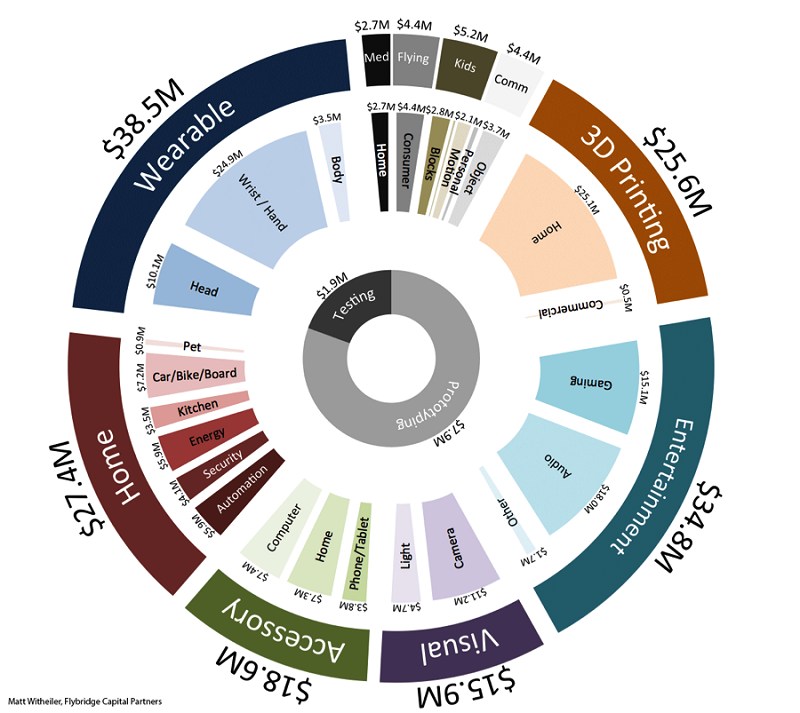 其中,儘管科技相關的項目不是集資最成功的類別(2014年科技相關成功達到集資目標的項目為1124個,而達標項目最多的為音樂產業,有4009個項目),但卻是吸引最多人表示支持的產業,當中又屬穿戴式裝置、3D列印、娛樂以及智慧家庭四種類型獲得較多的集資金額,佔有硬體集資金額的67%。