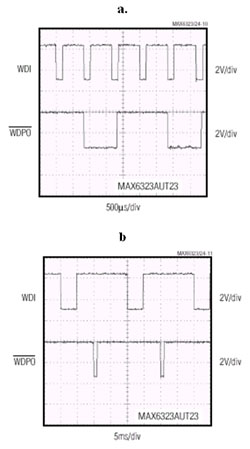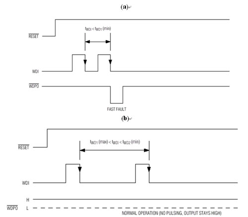 這類看門狗計時器有三種運作模式選擇,當它的切換動作發生時間早於較短時限,也就是tWDT < TWD1(min)時,那麼就會在/WDPO接腳上觸發一個低邏輯位準有效信號,長度約為1ms,如圖一a。如果微處理器送出脈衝的時間晚於看門狗計時的較長時限tWD2,那麼也會送出一個脈衝,如圖一b。在微處理器正常運作的過程中,WDI接腳上看門狗計時器信號序列中第二個脈衝的下降緣會發生在tWD1之後與tWD2之前。