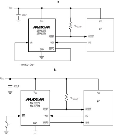 MAX6323/MAX6324提供的另一個功能為去彈跳(de-bounce)手動重置,要避免微處理器在看門狗計時器發生錯誤時將有問題的資料寫入RAM記憶體,部分應用需要能夠發出重置脈衝的監測元件,要實現這個功能,只要簡單地將/WDPO與/MR接腳相連即可,請參考圖二a。手動重置同時也可以讓操作人員在電源啟動的情況下進行微處理器線路的測試,如圖二b,當/WDPO連接到微處理器的NMI輸入,同時看門狗計時器的時限超過時,微處理器可以選擇等待使用者的介入,例如在個人電腦的場合,或者是將軟體的執行導引到另一個區段程式碼的開頭以便從錯誤的狀態中回復。