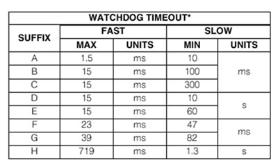 MAX6323/MAX6324元件提供有如圖四中8個標準的窗格型看門狗版本,較窄且較短的看門狗窗格時限適合如汽車安全性等對於時間要求較嚴格的應用,反之對於速度較慢的應用,例如病患監測,就適合窗格較寬的版本。由於汽車應用需要窗格型看門狗功能,因此這兩款產品提供了-40oC到125oC的工作溫度範圍,同時它們的重置功能也對於短時間的VCC電壓瞬間變化具有抵抗的能力,要得到更高的抗干擾能力,我們可以在VCC接腳上連接小型的RC低通濾波器。