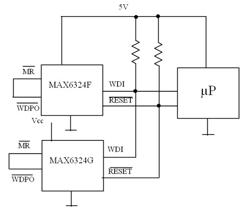 將看門狗計時器窗格變窄,我們就可以達到更緊密的系統控制,如果窗格必須相當窄,那麼可以使用兩個MAX6324的組合,請參考圖六,這個組態同時也提供了監控兩個電壓的彈性。其中F版本擁有最長39ms的時限,而G版本則擁有最短47ms的時限,保證/WDPO不被觸發的看門狗計時器窗格時間為8ms,如果計時電路沒有在這個短時間內對看門狗計時器進行重置,那麼將會觸發錯誤警告。