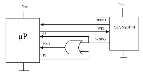 另一個確保系統正常運作的方法是讓微處理器與監測元件兩者相互監控,請參考圖七,其中微處理器連接埠的一個接腳P2被設定為高電位,因此會讓高電位的OR閘失效,微處理器讓MAX6323在/WDPO接腳發出脈衝,不管是在早於較短時限的時間對WPI接腳進行切換,或者完全不動作,接著/WDPO脈衝會由另一個輸入接腳P1接收並視為確認信號,因此可以用來顯示看門狗計時器是否正常運作。