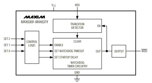 美商美信(Maxim)公司也推出了MAX6369-MAX6374系列等可透過接腳控制的看門狗計時器產品,請參考圖八,它們提供了可以控制啟動延遲與看門狗計時時限的彈性,並帶來看門狗計時器輸出波寬與輸出組態的選擇,甚至可以在運作時重新規劃組態。