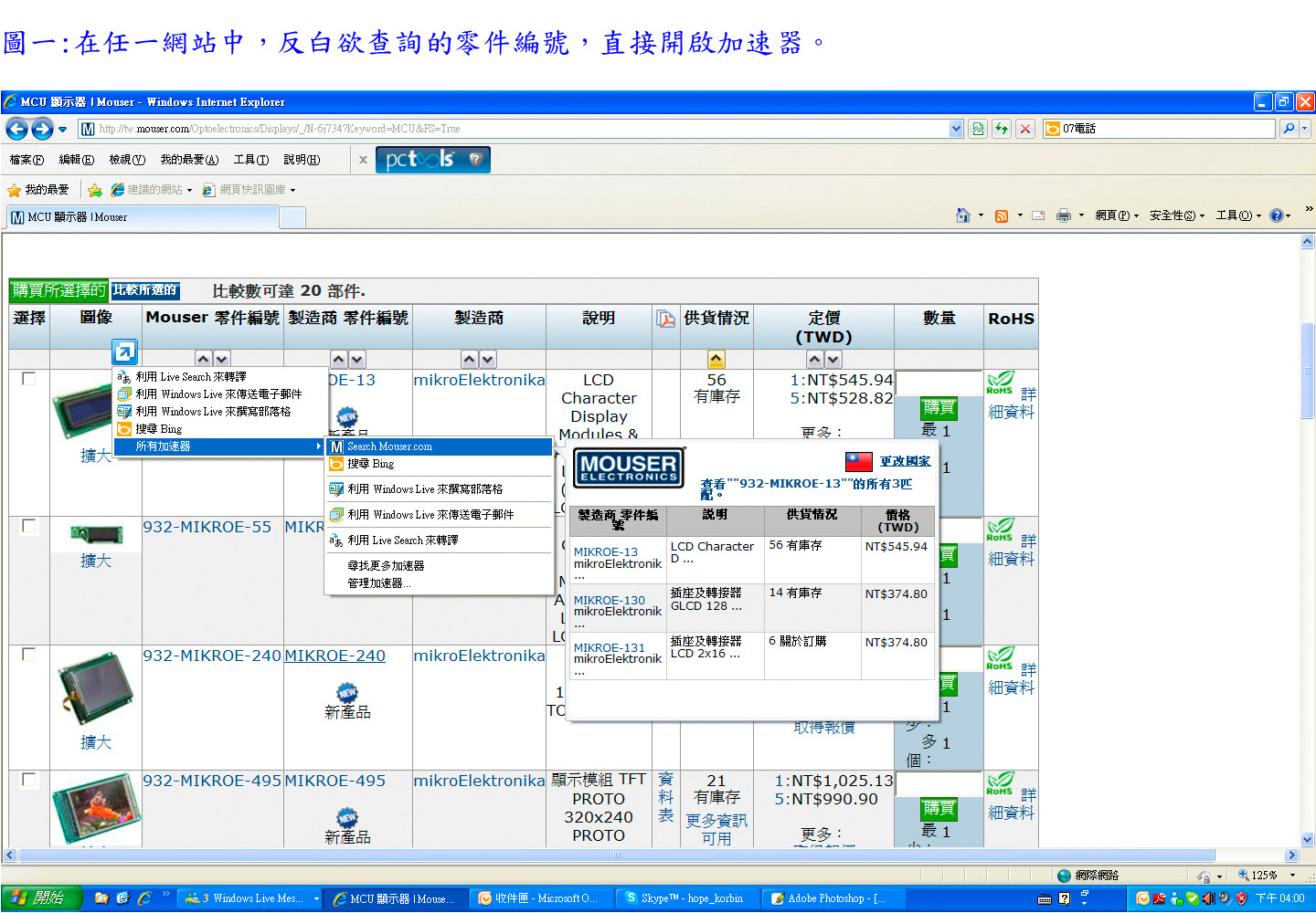 田吉平表示,使用者在搜索零件和查詢有無存貨時,常常會開啟很多個瀏覽器視窗和標籤,不僅畫面煩雜,查詢效率也不彰。因此,Mouser的搜索加速器直接在瀏覽器上提供資訊,讓用戶在查詢零件資料時,只要反白網頁上任一個零件編號或者關鍵字,就能立刻預覽產品詳情,不需要離開當前頁面,也不需要打開新視窗,提高零件查詢的效率。