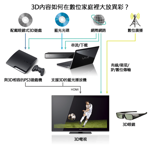 除了3D面板和3D眼鏡之外,顯示格式、訊號傳輸、壓縮機制與檔案儲存格式更是攸關3D電視的品質。光靠3D電視並不能一勞永逸,3D電視產業鏈還有許多課題尚待克服,產業界目前正拉大視野,從顯示、傳遞與格式等各層面關照3D電視全局。