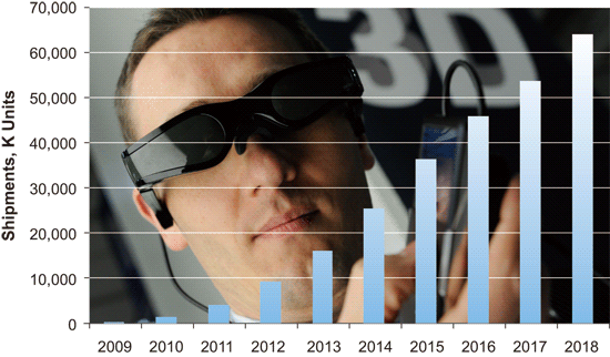 市調研究機構iSuppli便預估,今年全球3D電視出貨量可達420萬台,到2015年將巨幅成長到7800萬台,年複合成長率可達80%。預計今年全球3D電視的營收規模有74億美元,2015年此一規模將達到643億美元,成長幅度近8倍之多。