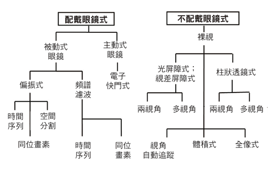 目前主流的3D電視顯示技術,便可分為配戴眼鏡式和裸眼式兩種,前者是藉由左右鏡片的輪流開關,創造出立體效果,包含主動式的電子快門眼鏡(Shutter Glasses)以及被動式的偏振(Polarization)技術;後者則是使用者不需配戴眼鏡即可觀賞立體畫面,主要以光屏障式(Barrier)和柱狀透鏡(Lenticular)技術為核心。一般而言,主動電子快門式3D眼鏡大部分搭配的是幀幅序列方式的顯示面板,被動偏振式3D眼鏡則搭配的是貼上偏光片的顯示面板。