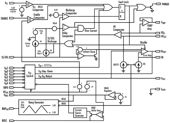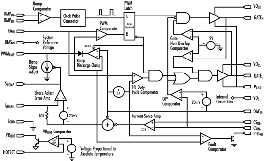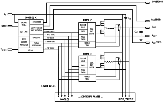 因此,控制裝置配備所有每轉換器一組的電路系統,其中包含電壓識別(VID)、PWM斜波震盪器、誤差放大器、偏置電壓、故障偵測及其他所需功能,以符合負載路線及瞬變反應的要求,並滿足目前及未來的微處理器以及非CPU應用的需求;而相位IC則配備所有每相一組的電路系統,其中包括柵驅動器、PWM比較器及鎖存器、過電壓保護及電流感應和共享。