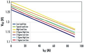 在控制方面,Xphase能實現前饋電壓模式控制,配合經改良的第三類補償、拖曳端調節功能及配接電壓定位,使控制器能根據每一相位輸入電壓之變化自動調適,同時降低在負載瞬變期間的電壓變化,使重負載時的功率損耗降至最低。另外,工程師可以將控制器加以修改調整,使迴路反應達到200ns或更快的時間。本技術在低VOUT/VIN比例下,可發揮快速的瞬變反應,並在最小輸出電容量下獲得負載瞬變反應。(圖二)描述了對Xphase負載線路容差所進行的蒙地卡羅(Monte Carlo)分析,說明Xphase控制器可達到20mV的負載線路容差,性能優於VRM10規格。