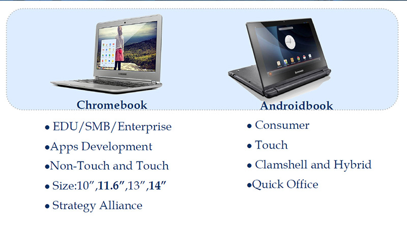 江芳韻指出,出貨越多對Google而言越是有利,因消費者不僅要支付Chromebook裝置費用,同時也必須支付背後IT後台的維護費用,因此Google積極推廣Chromebook。為此,Google開始加強發展App的部分,積極增加App數量,並且也將在明年的Chromebook中新增觸控功能,以因應越來越多App使用。此外,Androidbook也將在明年進入市場,大多會以可折疊或者與平板混和的形式。而為了滿足消費者對於Office的需求,Google也在日前收購行動辦公室解決方案廠商QuickOffice,提供類似Office軟體。江芳韻表示,隨著Google的加入,各個平台的競爭將會變得更加激烈。