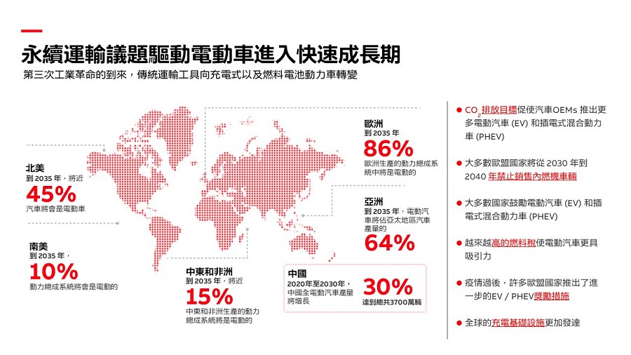 全球電動汽車產量預測將於2035年增加10倍,不但2021年全球電動車銷售量突破600萬輛,創下歷年最高成長幅度104%,2022年預估成長幅度為48%,預期電動車相關的供應鏈導入自動化的成長速度迅速。