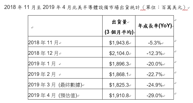 SEMI(国际半导体产业协会)公布最新Billing Report(出货报告),2019年4月北美半导体设备制造商出货金额为19.1亿美元,较2019年3月最终数据的18.2亿美元相比提升4.7%,相较於去年同期26.9亿美元则下降了29.0%。