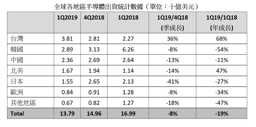 SEMI今天发表报告指出,2019年第一季全球半导体制造设备出货为138亿美元,较前一季下滑8%,与2018年同一季相比则减少19%。同时间,台湾则逆势成长,较前一季度成长36%。