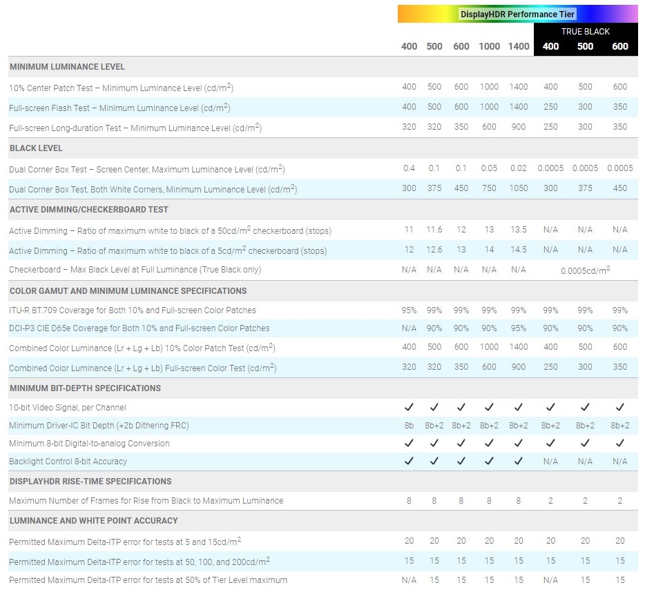 DisplayHDR True Black标准针对有机发光二极体(OLED),及未来的microLED萤幕等自发光显示器技术进行最佳化。全新的DisplayHDR True Black 600等级与现行的DisplayHDR、DisplayHDR True Black 400与500等级相比,能提供更高的亮度。 DisplayHDR与DisplayHDR True Black是显示器产业首批完全开放的标准,分别针对液晶萤幕(LCD)及自发光显示器提供HDR品质的规范。