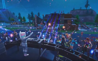 那一天,《要塞英雄》将玩家们引导进欢乐公园,并卸下玩家们的所有武器;不久之後,DJ Marshmello 以虚拟身分走上舞台,进行了 10 分钟的现场直播表演,音乐一下,正是最耳熟能详的〈Alone〉,「I’M SO ALONE, TRYING TO FIND MY WAY BACK HOME 2U」,字幕跟着节奏在舞台上轮替播放,制造出动感的舞台效果,搭配 Marshmello 不时穿??煽动气氛的手势和吆喝声,几??就是实体演唱会的完美复制,玩家尽情飞行、跳跃,恣意使出游戏里五花八门的舞蹈动作,就像是在表达自己在萤幕前慷慨激昂的情绪,整个舞台弥漫着自由奔放的气息,在这里,说是粉丝也好、玩家也好,千万名「嗨咖」无乐不欢。