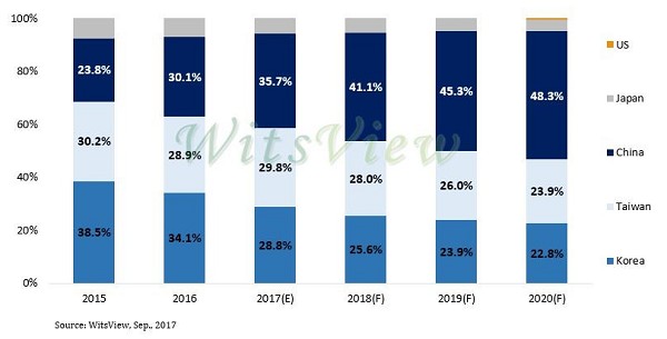 根据TrendForce光电研究(WitsView)最新数据,从面板产能供给面积的地区别来看,2017年中国将正式超越韩国成为大尺寸面板供给面积最大的地区,预估2020年中国地区供给率将朝50%迈进。