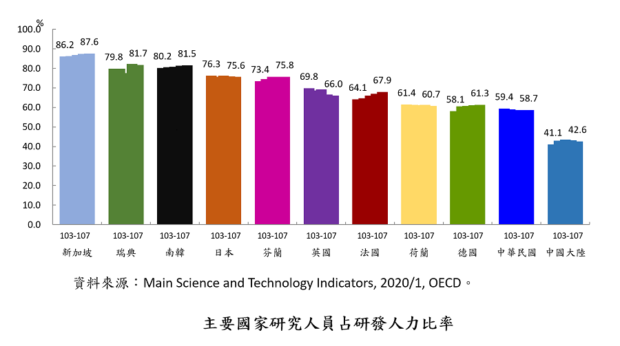 科技部指出,近5年台灣研究人員在研發人力的占比約在58.7%~59.4%,但有逐年下降之現象。與國際相比,新加坡、瑞典及南韓的研究人員占比皆達8成以上,台灣則與德國、荷蘭相近,約占6成。