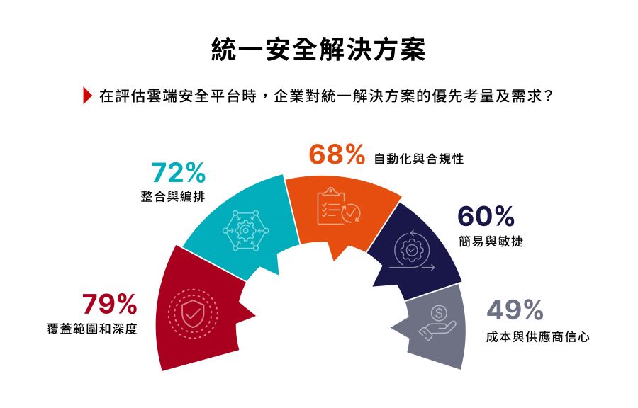 Fortinet調查指出,企業並非尋求單一解決方案來取代所有工具,而是將重點放在雲端環境的全面覆蓋與深度(79%)、跨資安領域的整合與協作(72%),以及自動化與合規能力(68%),這些因素甚至超越易用性或成本考量。