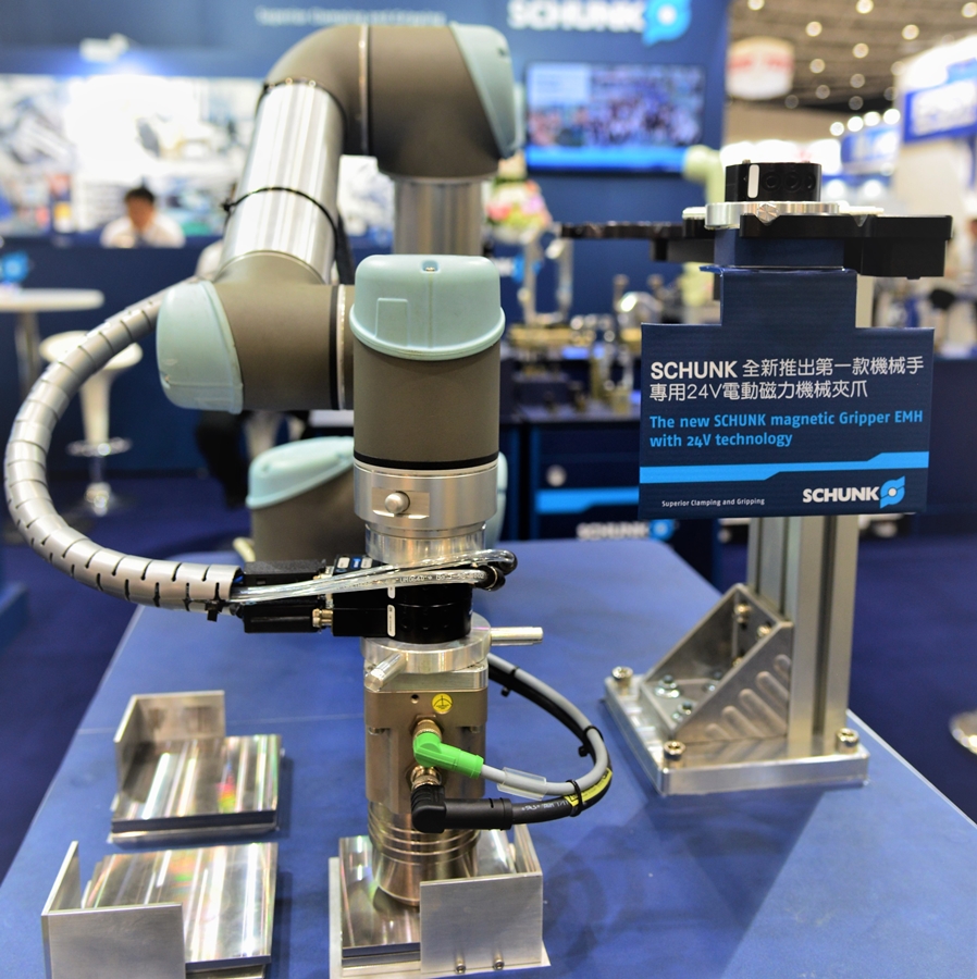 例如於會場展示最新首款內建電子元件的24V電動磁力機械夾爪EMH,便強調經內部整合電子元件,無干擾輪廓亦毋須使用額外控制器,不必任何裝調工作,就能交替搬運多種較薄工件和板材;同時在24V電源控制時,簡化連結和接線,係利用數位I/O埠通訊驅動,不會占用控制箱的空間,得以協助使用者節省成本,並最大程度減少了接線和調校工作。