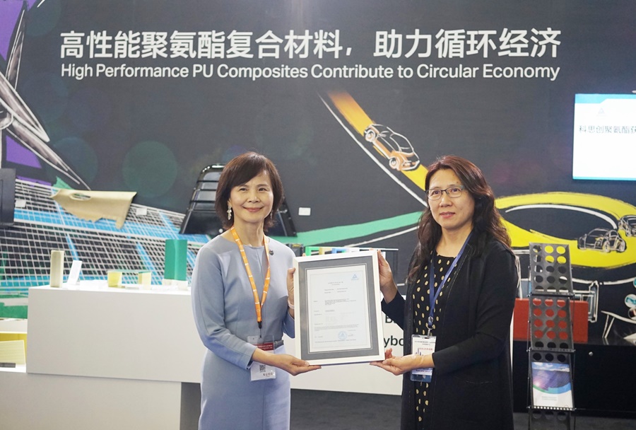 | 科思創聚氨酯樹脂日前獲得TUV萊茵太陽能行業商用材料認證,客製化聚氨酯事業處亞太區研發副總裁李倩博士(左)代表科思創出席領獎。 |