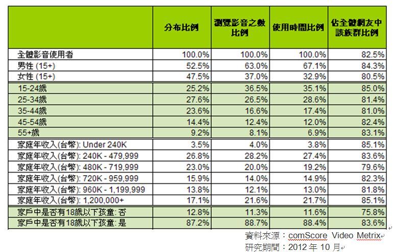 Video Metrix人口輪廓報告觀察顯示,2012年10月台灣瀏覽影音的網友性別分佈是52.5%男性與47.5%女性,但男性使用狀況為女性的兩倍;年齡方面25-34與15-24歲族群佔比最高,使用狀況則是年齡越長佔比越低。自10月起Video Metrix新增人口變項包含使用者家庭年收入、家戶中是否有18歲以下孩童與家戶人口數,資料顯示,家庭年收入為台幣24萬-48萬的使用者佔比較高、其次是48萬-72萬,但使用影音狀況比例較高的為家庭年收入24萬-48萬、120萬以上與48-72萬的使用者族群。使用者家中有18歲以下孩童的比例佔影音使用者的87.2%,使用狀況的比例也是顯著較家中沒有18歲孩童的使用者高。