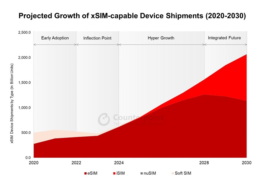Counterpoint Research分析指出,全球xSIM功能裝置出貨量在2024年至2030年間將超過90億台,以22%的年複合增長率(CAGR)長。這一預測包括所有形式的eSIM(eUICC)、iSIM(iUICC)、nuSIM和軟體SIM。