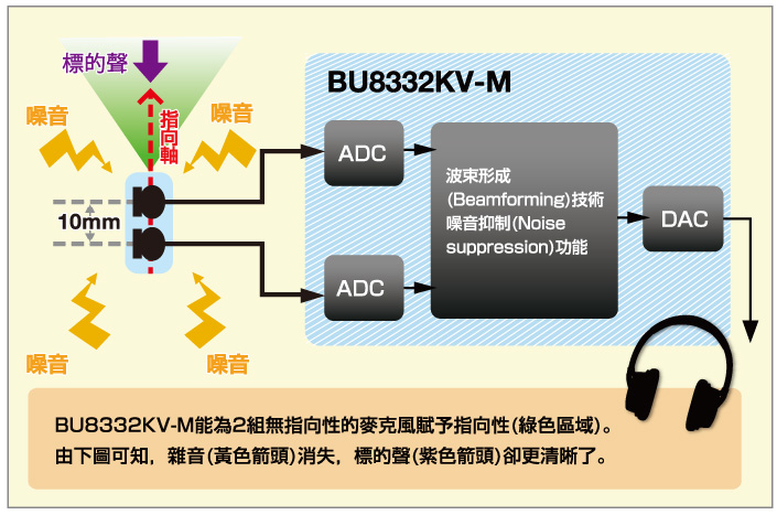 半導體製造商ROHM株式會社(總公司:日本京都市)全新研發出數位訊號處理器IC「BU8332KV-M」,適合智慧型手機及汽車導航裝置上的麥克風使用,為2組無指向性的麥克風賦予敏銳的指向性(波束形成(Beamforming)技術),以提升音訊品質。