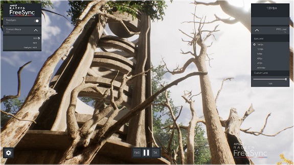 AMD推出「The Oasis」互动展示软体,能够充份展现AMD Radeon FreeSync与FreeSync 2 HDR显示技术的卓越功能与优势。使用者可以在FreeSync与FreeSync 2 HDR等各种FreeSync模式中切换,透过The Oasis呈现穿越巨石神庙废墟後映入眼帘的天堂妙境,以及绿意盎然生机蓬勃的样子。