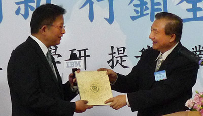 百位代表雲集同賀IBM正式啟用位於南港的全球研發中心。除了行政院長吳敦義親與台灣IBM總經理于弘鼎進行啟動儀式,當年促成IBM進駐南軟的政務委員尹啟銘,也特別將十幾年前IBM的贈書「還」給IBM珍藏,他有感而發:「感謝IBM當年很不聽話,不願意把製造工廠設在台灣,才讓台灣拉大兩岸差距,成為全球研發中心!」 (圖/致宜)