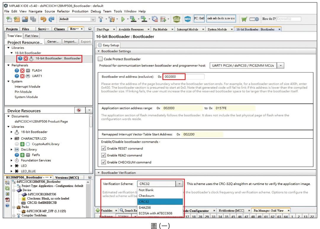 圖(一)是MCC 16位元Bootloader函式庫中Bootloader專案配置的示意圖。使用者只需決定應用程式的起始位址與應用程式的驗證方式,即可快速產生您的Bootloader專案。目前可選用的應用程式的驗證方式包含:Not Blank、Checksum、CRC32、SHA256與ECDSA with ATECC608等方式。