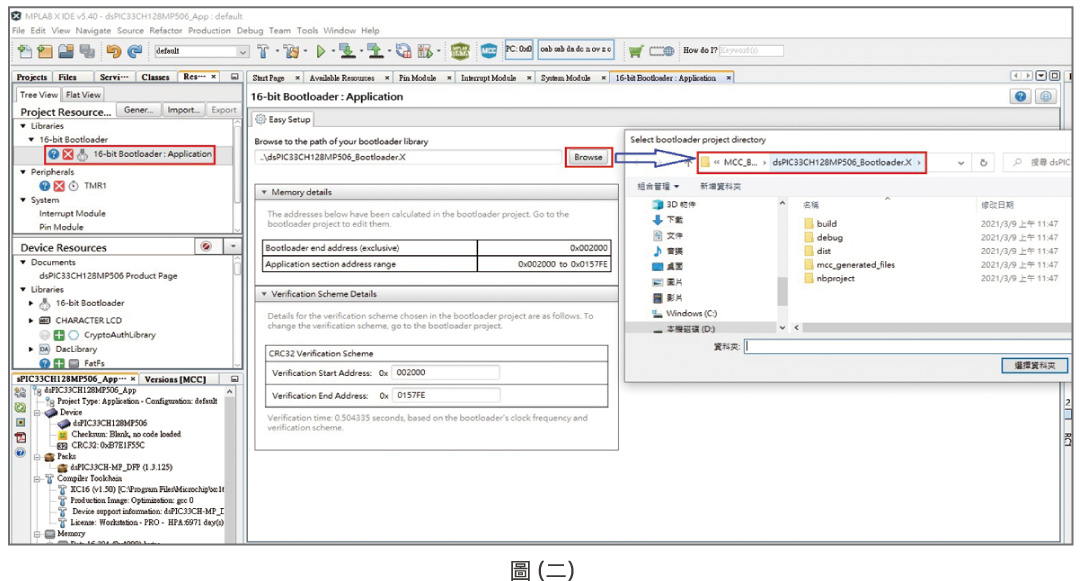 下圖(二)是MCC 16位元Bootloader函式庫中應用程式專案配置的示意圖。使用者只須將Bootloader專案中的路徑載入Application專案後,按下Generate Code按鈕即大功告成。MCC會自動將Reset Vector與IVT重新映對到應用程式新的起始位址。