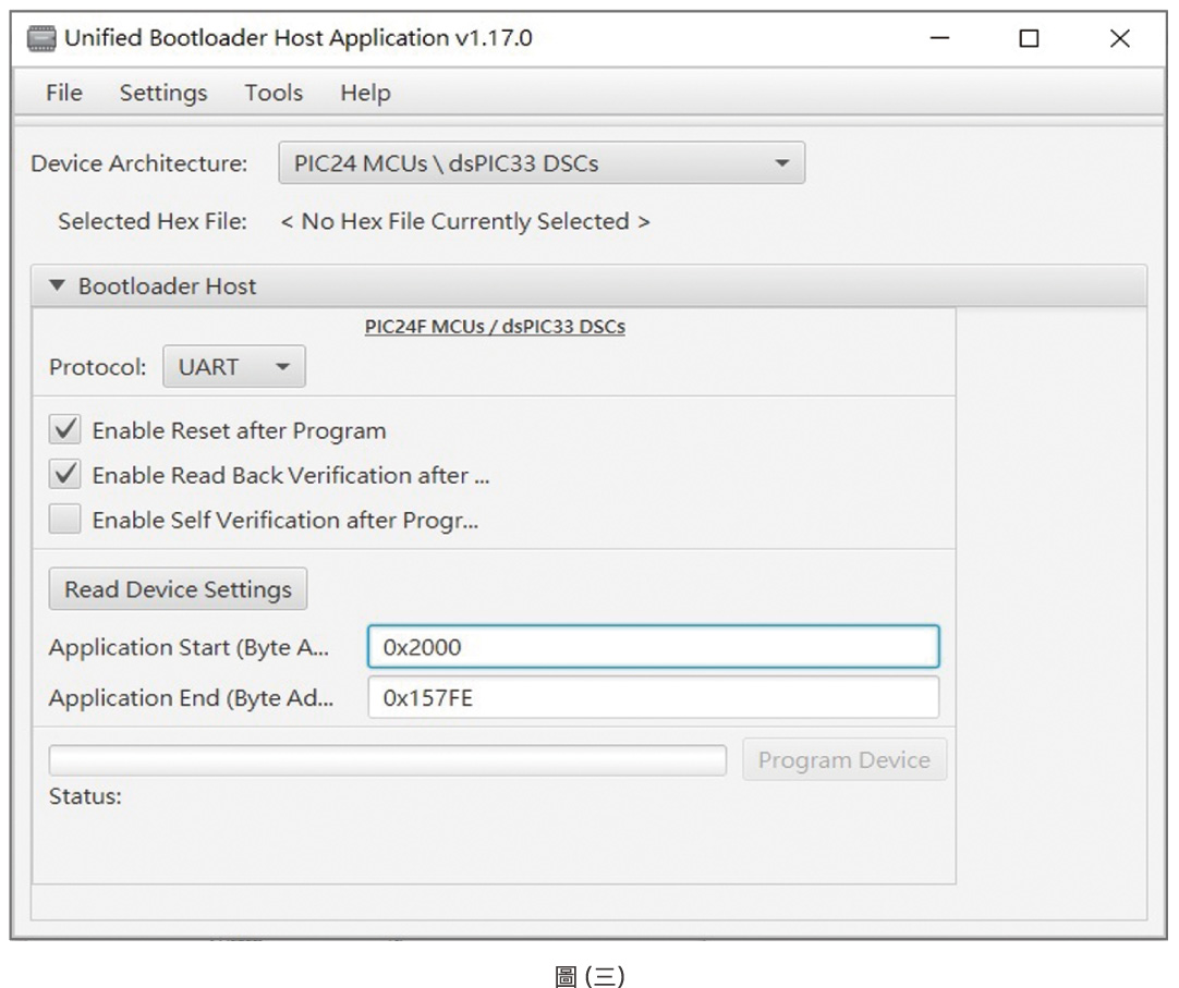 下圖(三)是 Unified Bootloader Host Application(UBHA)工具的示意圖。使用者只需要參考Bootloader專案的配置來設定應用程式的起始位址、結束位址與UART通訊介面的正確baud rate後,接著載入欲更新的應用程式Hex檔並按下Program Device按鈕,即可進行韌體更新。韌體更新狀態可透過Tools選單中的Console功能來監看。
