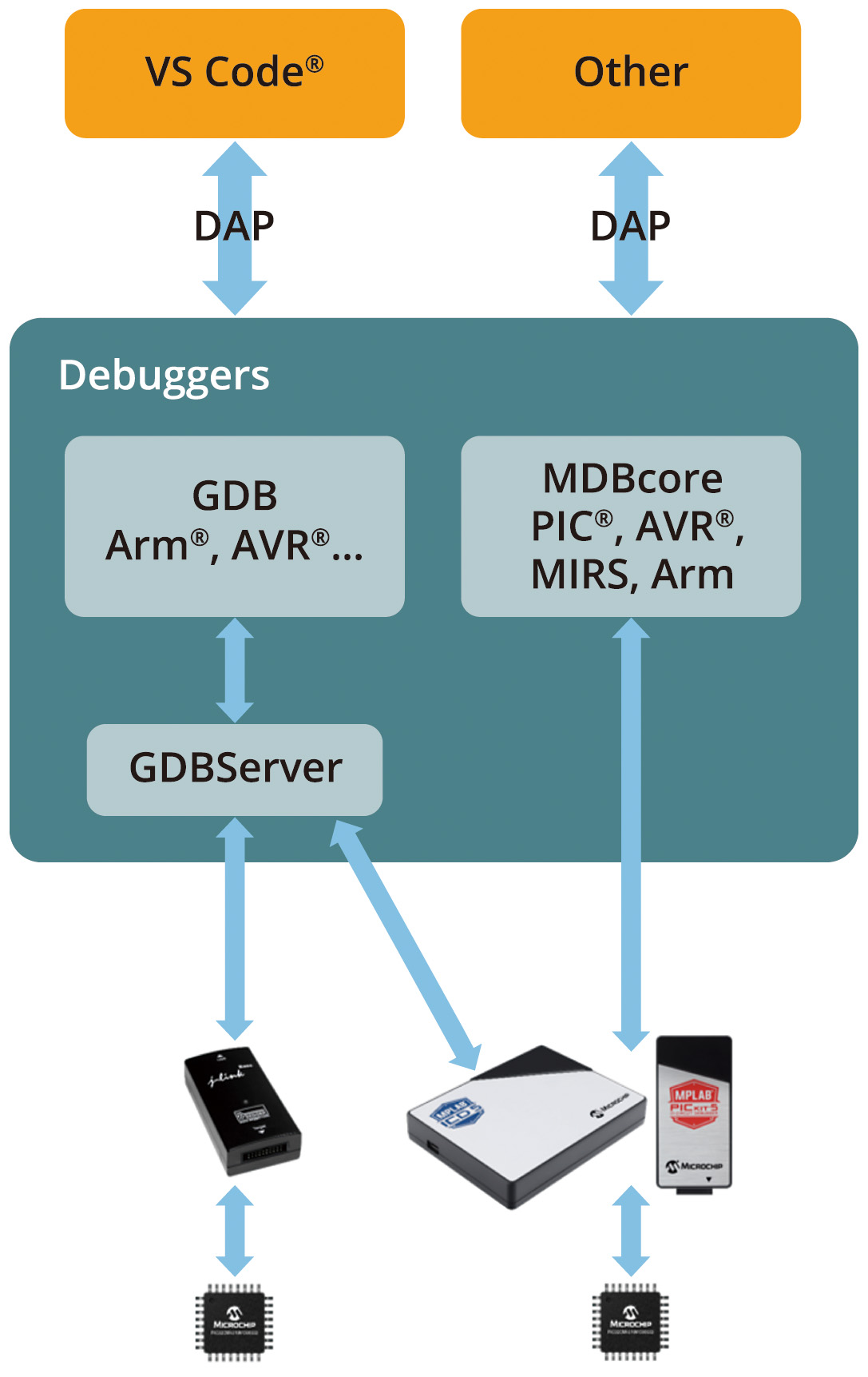 ●無縫除錯整合:將開發者常用的MPLAB PICkit™ 5、MPLAB ICD 5與SNAP等線上燒錄器/除錯器,以及CMSIS-DAP工具,完美無縫地整合進VS Code原生的除錯工具列中,讓除錯流程直覺又順暢。
